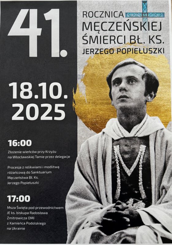 Zapraszamy na Uroczystość z okazji 41. rocznicy męczeńskiej śmierci bł. ks. J. PopiełuszkiOpublikowano: 08 października 2025 | Drukuj | Odsłony: 26 Następny artykuł